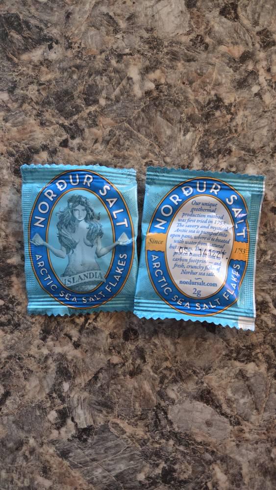 250 grams (approximately 8.8 ounces) or 125 grams (approximately 4.4 ounces) of sea salt flakes packaged in either a box with beautiful Alda guarding over the flakes or in a custom-designed tin. Flavored sea salts are packaged in 100 gram (approximately 3.5 ounces) boxes. Norður salt sachets are 2 grams each and come packaged in sets of 6 or 12.